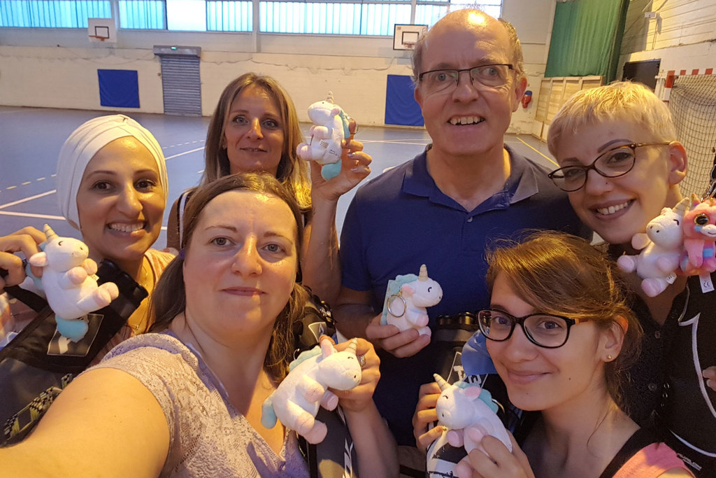 Ce lundi 4 juin 2018, Vanessa B., Julie C., Magali H.-B., Assia L. G. et Mélissa M., pour leur dernier cours de la saison avec Lionel I. ont choisi comme emblème de leur groupe de débutantes adultes, La Licorne.