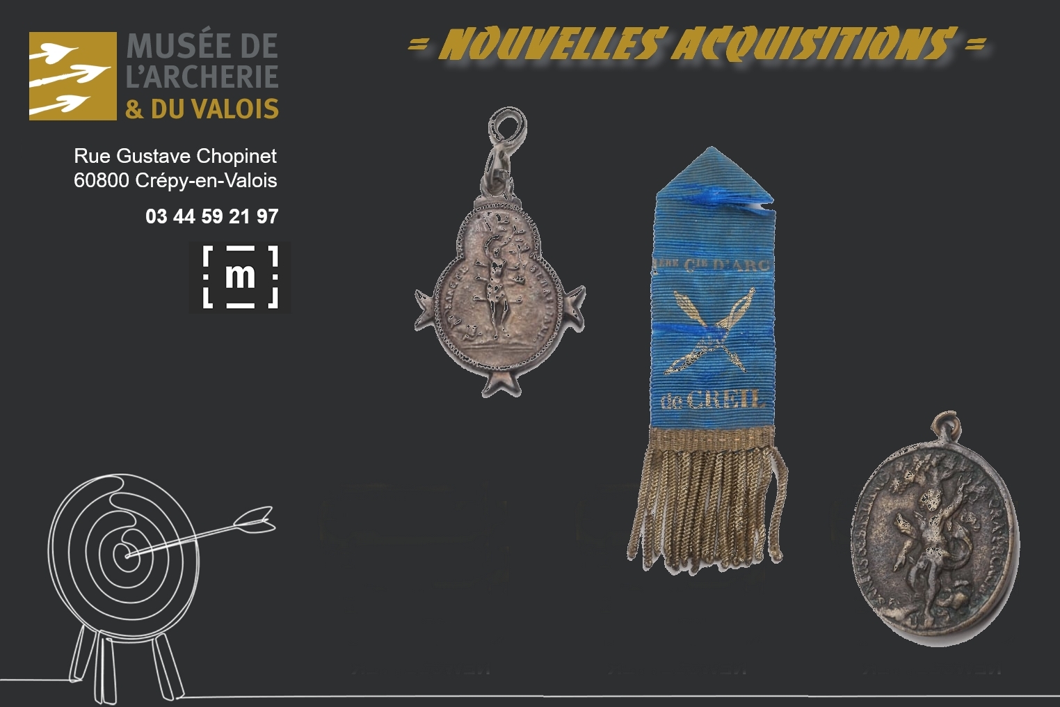 L’association des Amis a offert au musée deux médailles datées du XVIIIe siècle et un ruban bleu daté du XIXe siècle de la 1re Compagnie d’arc de Creil, acquis lors d’une vente aux enchères en décembre dernier.