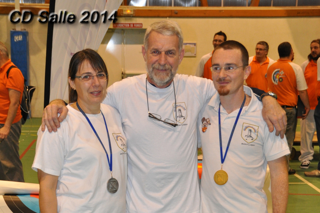 Félicitations à Christophe, 1er en barebow (arc nu) et à Laurence, 2e en VF arc classique, ici en photo avec Manu, notre coach, pour leurs médailles au championnat départemental salle 2014 qui s'est disputé ce week-end à Wissous.