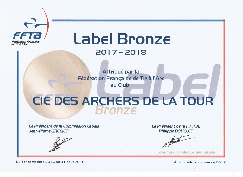 La FFTA vient d'adresser à la compagnie des Archers de la Tour le Label Bronze 2017-2018 qui vient confirmer celui obtenu pour la période 2015-2016.