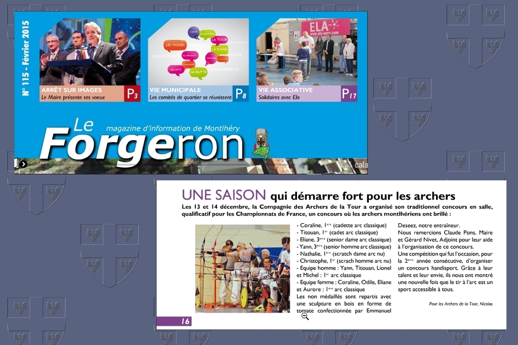 Dans son numéro 115 daté de février 2015, Le Forgeron, magazine d'information de Montlhéry, revient sur le concours de tir en salle organisé par les Archers de la Tour en décembre dernier.