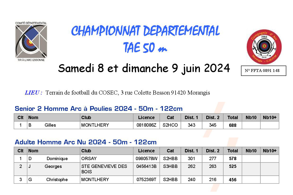 Cette fin de semaine des 8 et 9 juin 2024 s'est disputé le championnat départemental de l'Essonne de Tir à l'Arc Extérieur (TAE) à 50 m.