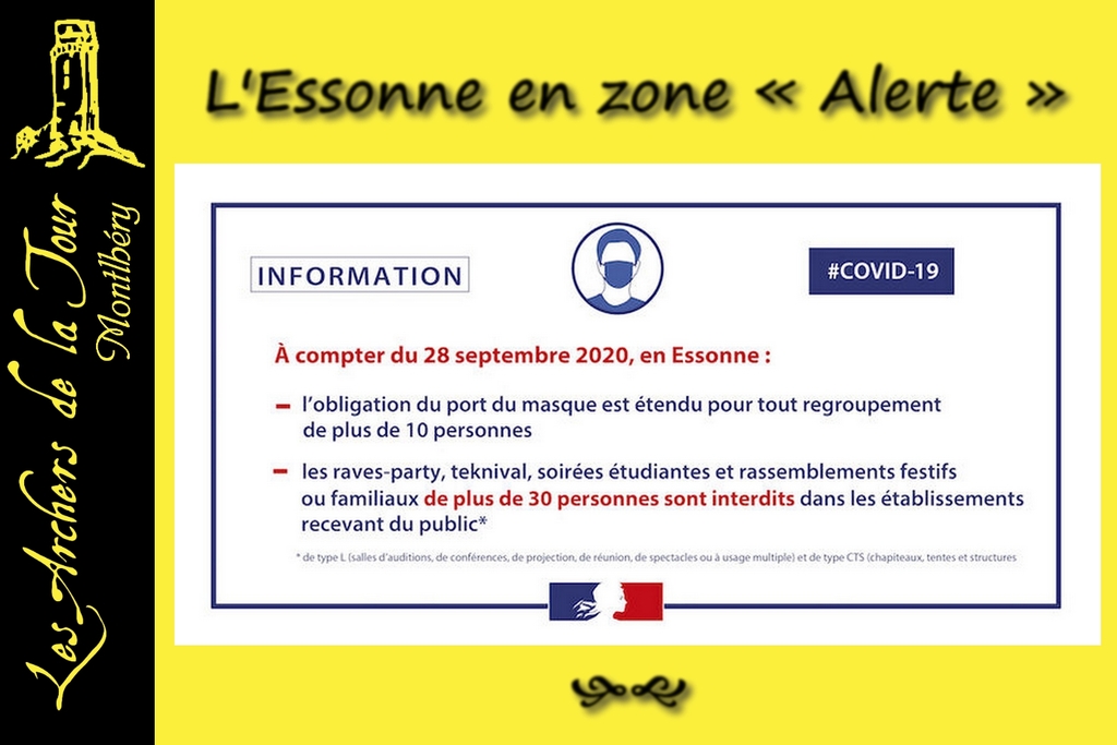 Suite aux annonces gouvernementales, le département de l’Essonne est classé en zone « Alerte » et de nouvelles mesures entrent en vigueur (arrêté de la préfecture de l'Essonne n° 2020-PREF-DCSIPC-BDPC N°1164).