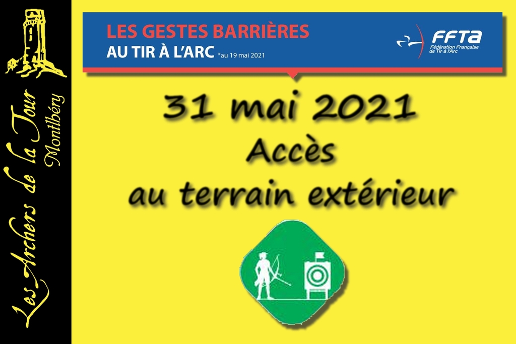 Le terrain extérieur sera de nouveau accessible aux archers de la compagnie à partir du 31 mai 2021, sous réserve, sous peine de fermeture immédiate, du strict respect des mesures sanitaires nationales déclinées par la FFTA et la Mairie de Montlhéry.