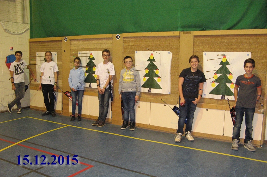 Pour leur dernier cours de l'année les jeunes archers de la compagnie, après avoir tous remporté leur flèche blanche, ont disputé un tir au sapin (voir la photographie).